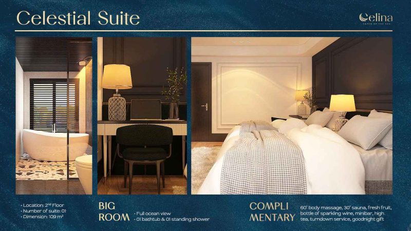 Celina Of The Seas cung cấp các hạng phòng từ Suite tiêu chuẩn đến President Suite, tất cả đều mang lại trải nghiệm nghỉ dưỡng đỉnh cao.