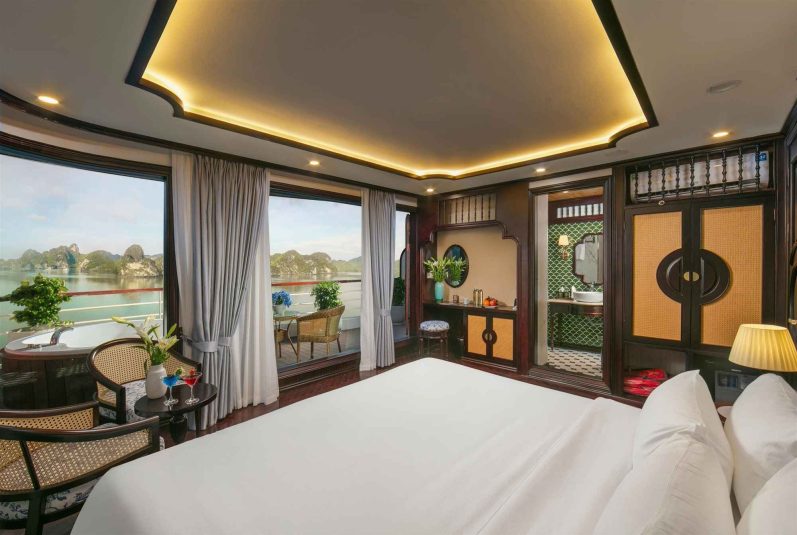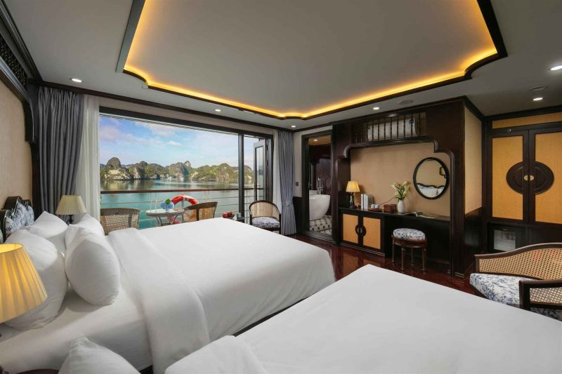 Du thuyền cung cấp các hạng phòng từ Suite đến President Suite, tất cả đều đạt chuẩn 5 sao quốc tế. Mỗi cabin là một “ốc đảo riêng tư” với ban công riêng biệt, bồn tắm nằm view biển, giường ngủ êm ái, tiện nghi hiện đại và thiết kế ấm cúng, tinh tế.