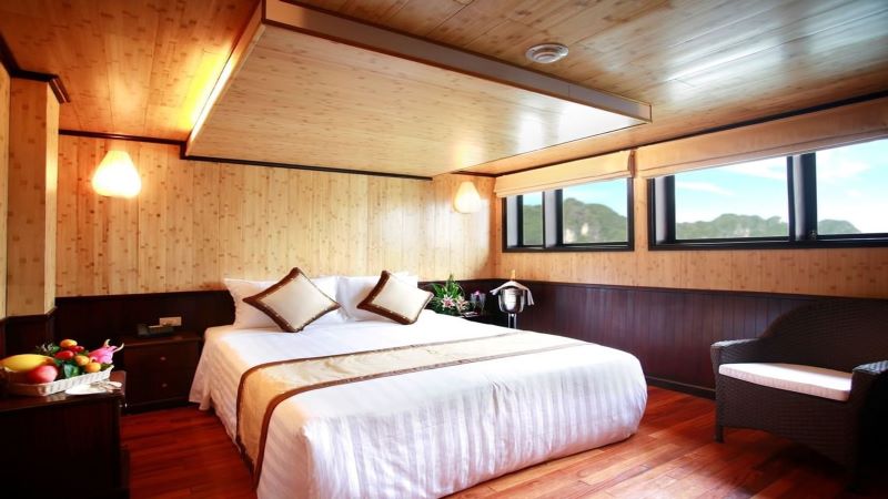 Hãy tận hưởng sự sang trọng tinh tế của Cabin Deluxe của chúng tôi, một thiên đường tiện nghi rộng 16m². Được thiết kế tỉ mỉ để mang đến sự thư giãn tối đa cho bạn, cabin cung cấp lựa chọn giường cỡ Queen êm ái hoặc hai giường đơn, phòng tắm riêng với vòi sen kiểu mưa hiện đại và điều hòa không khí có thể điều chỉnh hoàn toàn. Cửa sổ toàn cảnh đón nhận ánh sáng tự nhiên và mở ra tầm nhìn ngoạn mục ra vịnh yên bình, đảm bảo một hành trình khó quên.