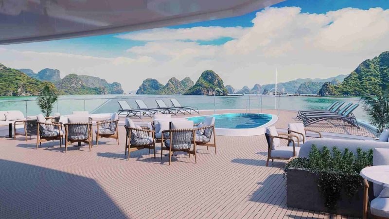 Nằm ở mũi tàu tầng 3, hồ bơi Sundara Jacuzzi là điểm nghỉ dưỡng đặc trưng của Aime’e Cruises, mang đến sự cân bằng hoàn hảo giữa thư giãn và sang trọng. Với tầm nhìn toàn cảnh Vịnh Hạ Long tuyệt đẹp, hồ bơi như mời gọi du khách đắm mình trong làn nước ấm áp, sủi bọt, đắm mình trong vẻ đẹp của biển xanh ngọc lục bảo và những vách đá vôi sừng sững.