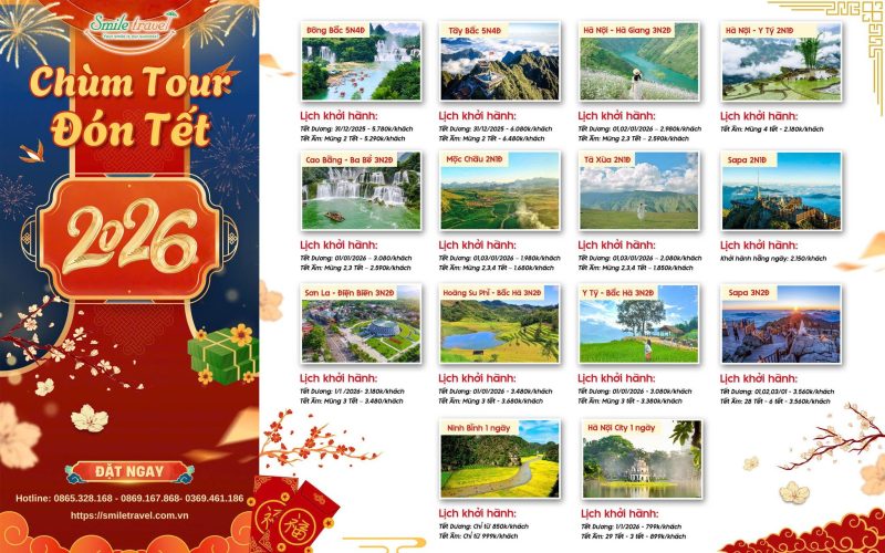 Smile Travel đã thiết kế và cập nhật các tour du lịch tết 2026 cực hot, giá cực tốt chỉ chờ quý liên hệ đặt tour, tư vấn hoàn toàn miễn phí từ đội ngũ nhân viên trẻ trung, năng động, nhiệt huyết.